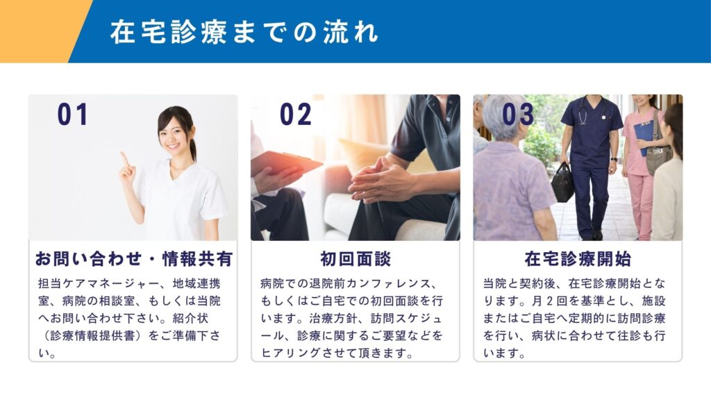 医師が定期的にご自宅にお伺いして診察しますので、通院は不要になります(続けることも可能です)。